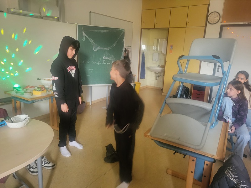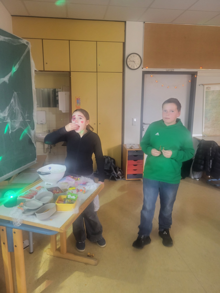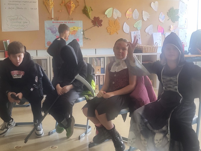 Am Freitag hatten wir dann auch eine Halloween-Party. Es gab viele Süßigkeiten, Tänze und Lieder und gemeinsame Spiele.
